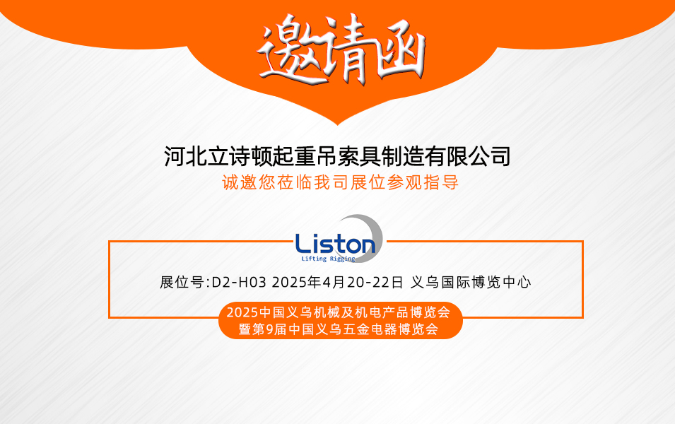 河北立詩頓起重吊索具制造有限公司誠摯地邀請您參加 2025 中國義烏機(jī)械及機(jī)電產(chǎn)品博覽會暨第 9 屆中國義烏五金電器博覽會。這不僅是一場行業(yè)盛會,更是我們攜手交流、合作共贏的契機(jī)。